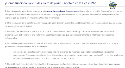 El Ministerio de Educación pone a disposición de las familias la plataforma “Solicitudes fuera de plazo – Anótate en la Lista”, un sistema digital que permite a apoderados buscar y solicitar vacantes en establecimientos educacionales públicos y particulares subvencionados, una vez finalizado el proceso regular de matrículas del Sistema de Admisión Escolar (SAE).