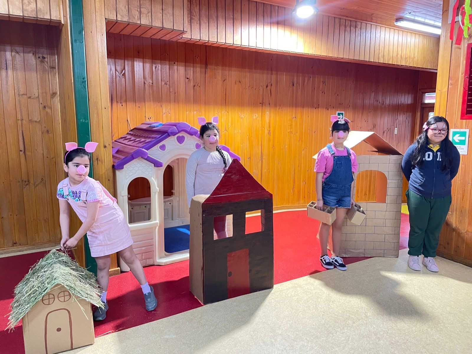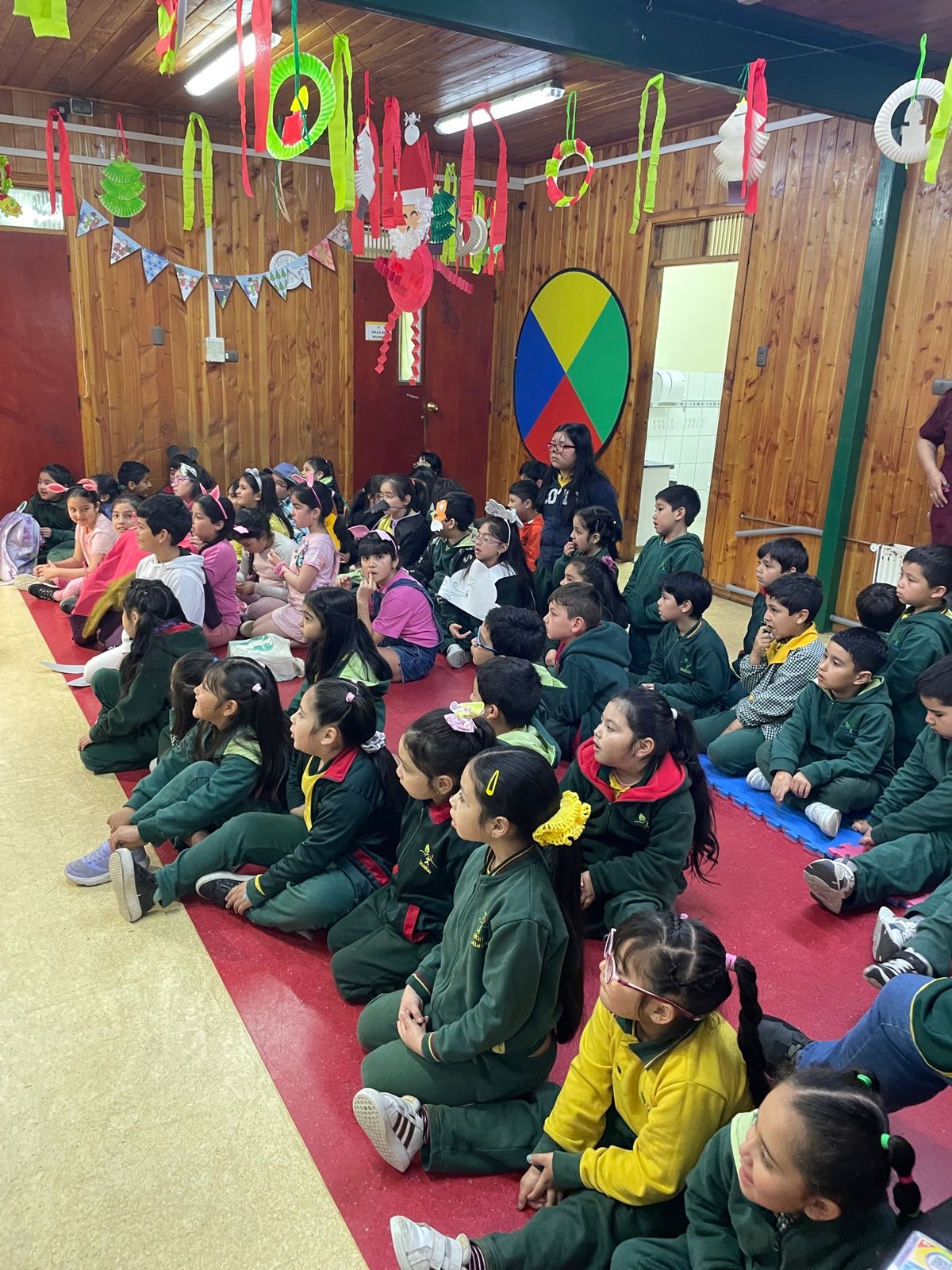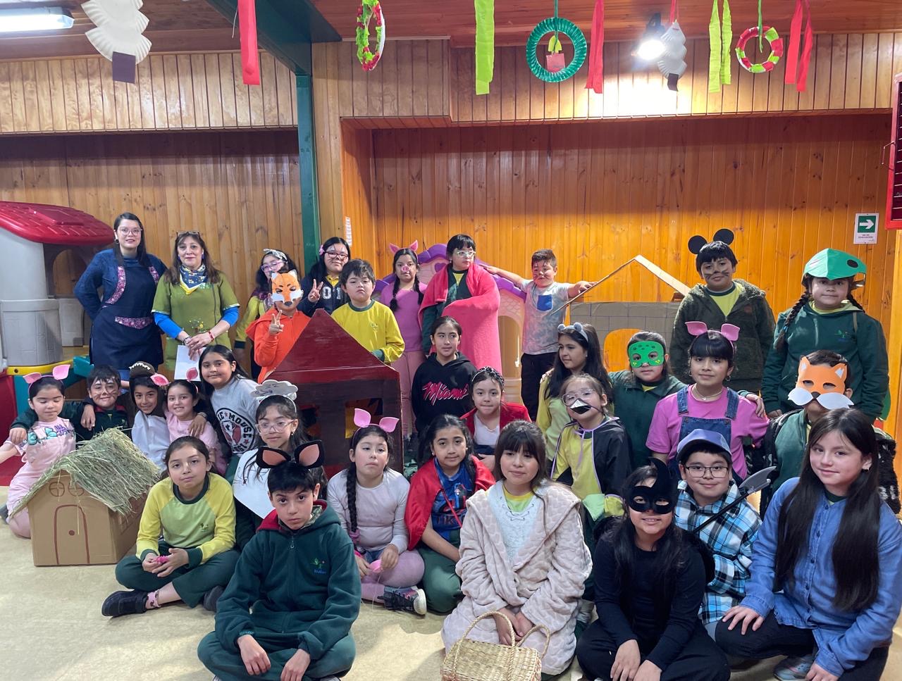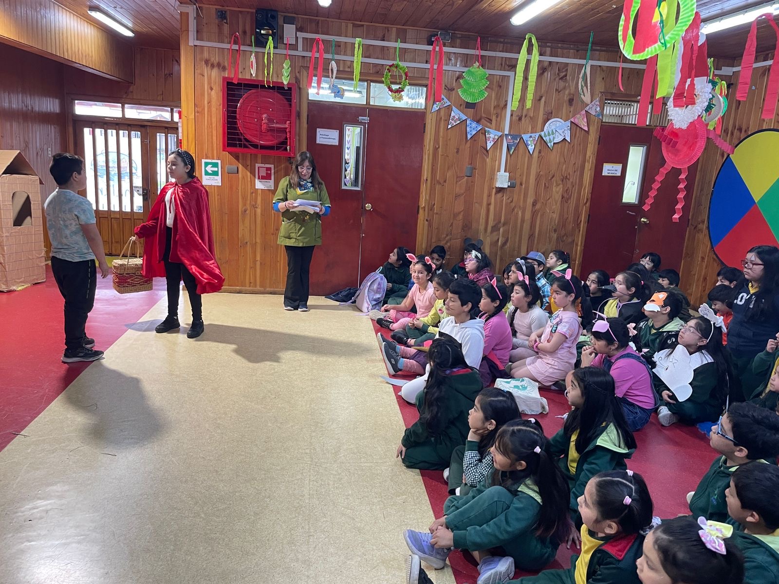 “Estudiantes de tercero básico presentan con entusiasmo sus obras de teatro, cautivando a los niños y niñas de kínder, quienes disfrutaron una experiencia única de aprendizaje, creatividad y compañerismo en un ambiente lleno de aplausos y alegría.”