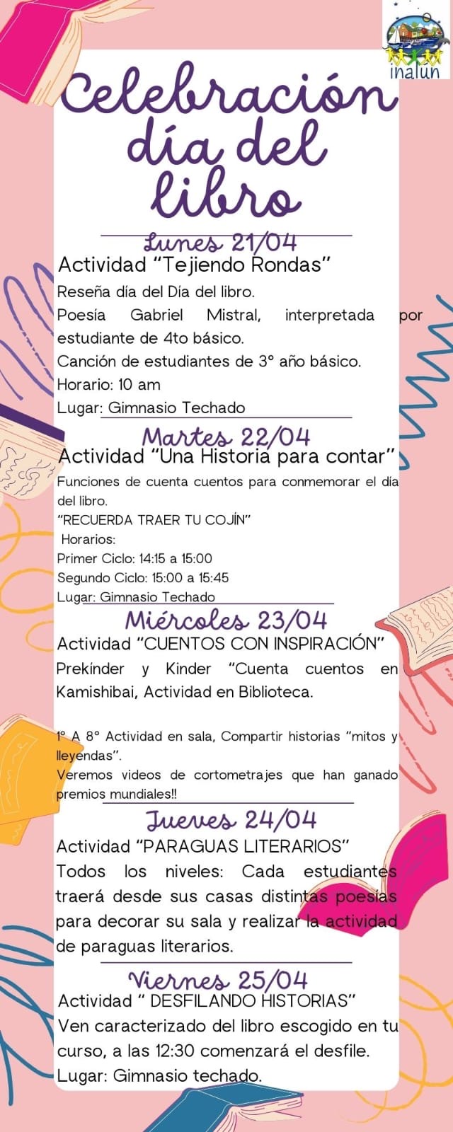 Como cada 23 de abril se celebra a nivel mundial el Día del libro y del Derecho de Autor, como una forma de destacar el libro como un vehículo de desarrollo de la humanidad. Nuestro colegio se une a esta celebración destacando el valioso aporte de la lectura y los libros en nuestra formación como personas.
