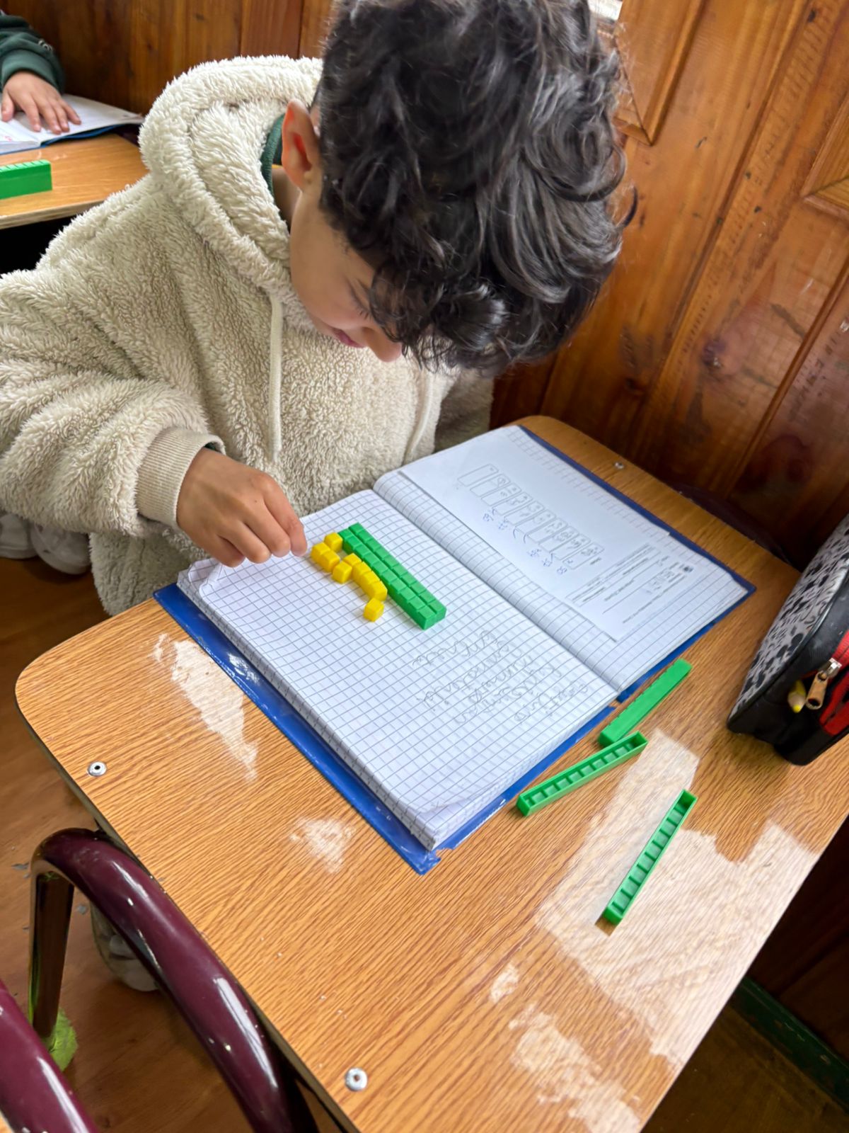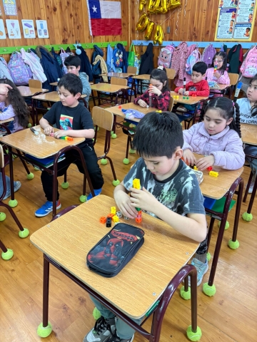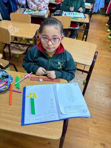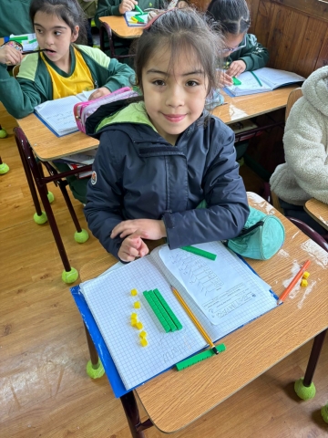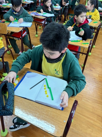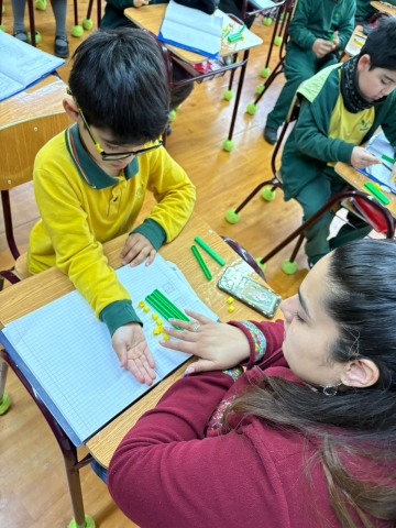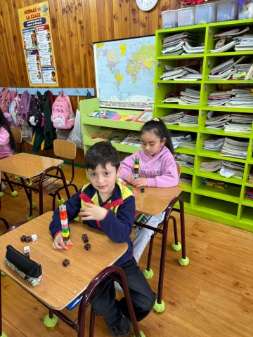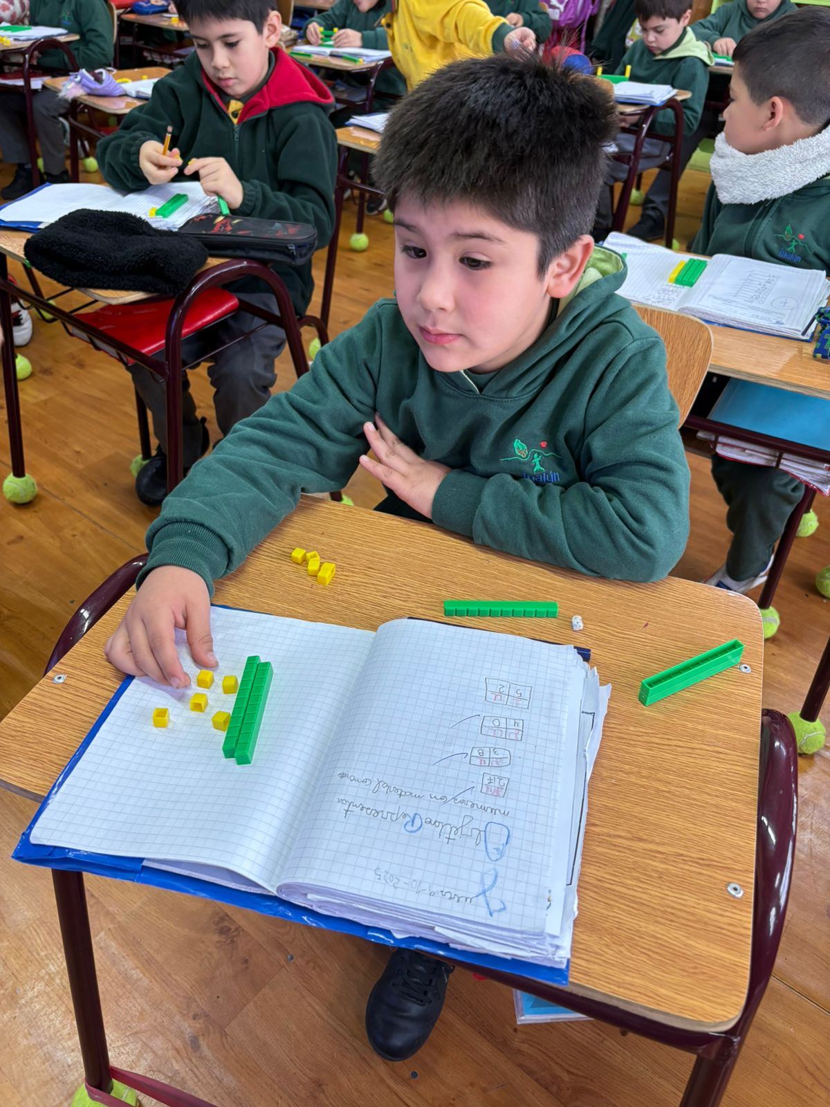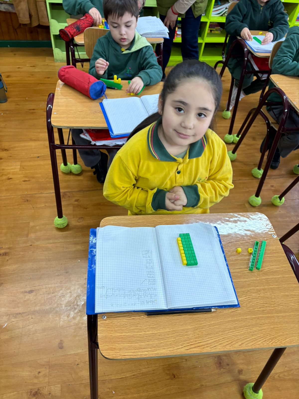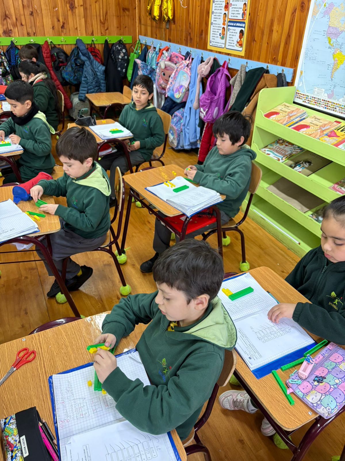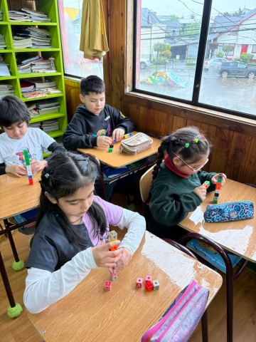 Estudiantes de primero básico utilizan los "Cubos unifix" y los "Bloques de base 10" en clases de matemáticas a cargo de la Profesora Denisse Bahamonde.