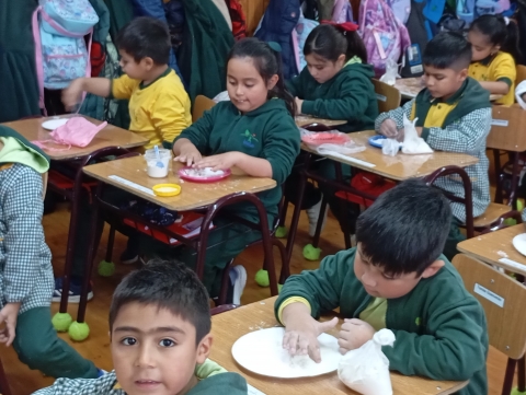Utilizando sus dedos, los niños exploraron libremente trazos, líneas y formas, comenzando a familiarizarse con el movimiento necesario para escribir. Este tipo de experiencias permite que el aprendizaje sea cercano, entretenido y sin presión, favoreciendo la confianza y la creatividad.
