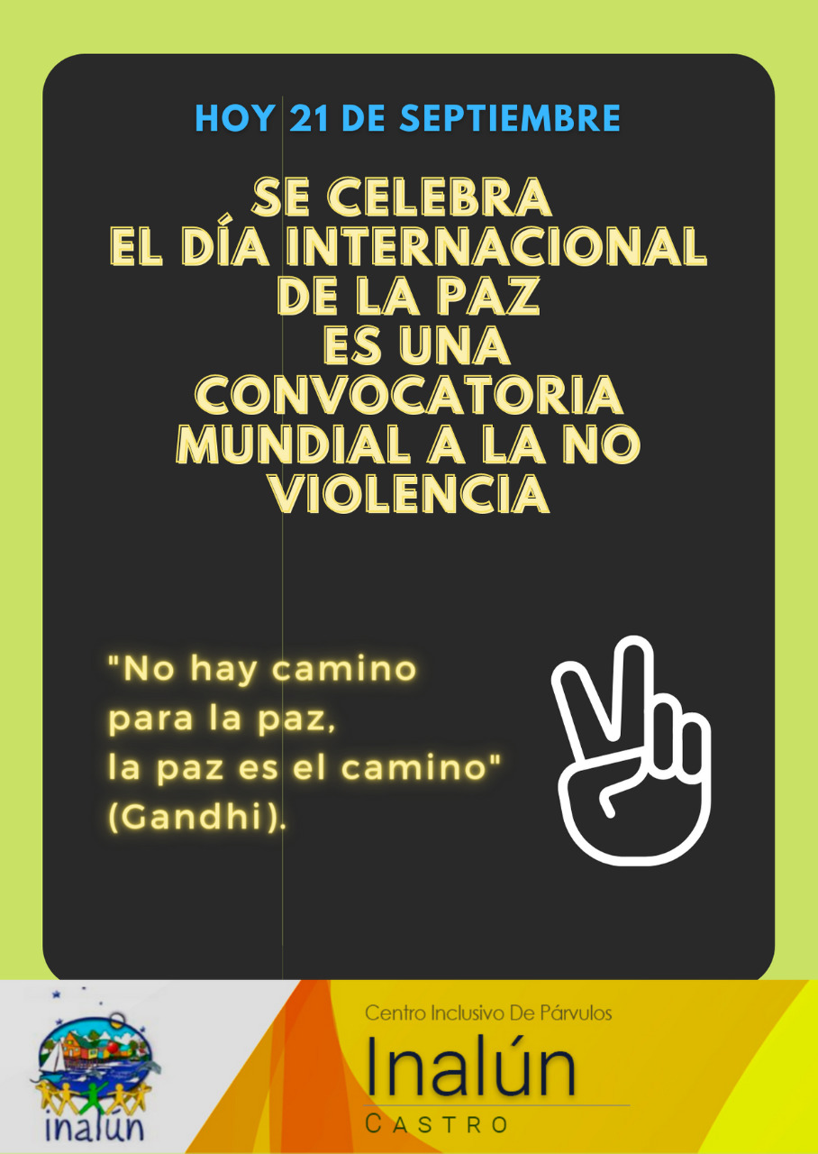 El 21 de septiembre se conmemora el día internacional de la paz y la no violencia, como comunidad educativa queremos transmitir este mensaje a todos los apoderados, estudiantes y funcionarios, por una educación sin violencia, con valores positivos para la sana convivencia. El día Internacional de la Paz es un día dedicado a conmemorar los ideales de paz de cada pueblo y cada nación
