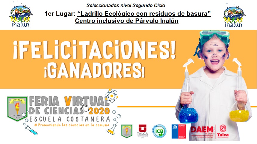Con gran éxito se desarrolló la Feria Científica virtual 2020, organizada por la Escuela Costanera de Talca, en donde nuestro establecimiento se presentó con la investigación del Ladrillo Ecológico con Residuos de Basura, dicha participación fue llevado a cabo por dos integrantes de nuestro Club Científico Picheke Inalufes, Catalina Vidal y Juan Pablo Rain del octavo año Básico, a cargo de la Profesora Andrea Seguel, nuestros alumnos lograron el Primer lugar del segundo Ciclo de nivel Básica.
