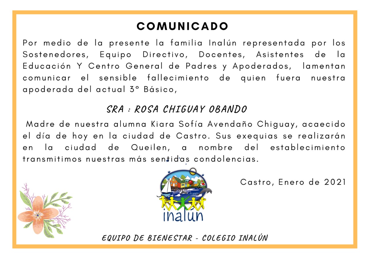 Informamos el sensible fallecimiento  de nuestro apoderada Rosa Chiguay Obando madre de nuestra alumna Kiara Avendaño Chiguay  de tercero basico.
