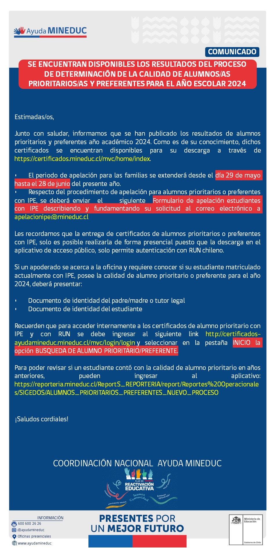 Comunicamos que se encuentran disponibles los resultados del proceso de determinación de la calidad de alumnos (as) prioritarios y preferentes para el año escolar 2024. Pueden revisar el comunicado del Mineduc en donde se explica cómo descargar el Certificado, periodo y procedimiento de apelación.