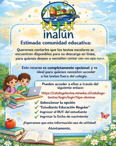 Submitted by profesor1 on Jue, 03/05/2026 - 10:18Con entusiasmo y muchas expectativas, la comunidad educativa del Colegio Inalun dio inicio a un nuevo año escolar. Durante la jornada del primer día de clases, estudiantes, docentes y asistentes de la educación se reencontraron en un ambiente de alegría y compañerismo, marcando el comienzo de un período lleno de aprendizajes y desafíos.