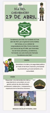 Submitted by profesor1 on Dom, 04/27/2025 - 13:32El Día del Carabinero nos permite reconocer y valorar el trabajo de quienes dedican su vida a proteger a los ciudadanos y ciudadanas de Chile. En Chile cada 27 de abril se conmemora la creación de la policía uniformada más antigua de América Latina. Este día es una oportunidad para reconocer y agradecer el trabajo de los Carabineros, quienes velan por la seguridad y protección de la ciudadanía.