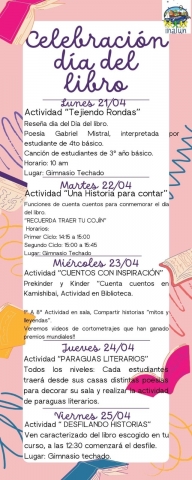 Submitted by profesor1 on Mar, 04/22/2025 - 17:52Como cada 23 de abril se celebra a nivel mundial el Día del libro y del Derecho de Autor, como una forma de destacar el libro como un vehículo de desarrollo de la humanidad. Nuestro colegio se une a esta celebración destacando el valioso aporte de la lectura y los libros en nuestra formación como personas.